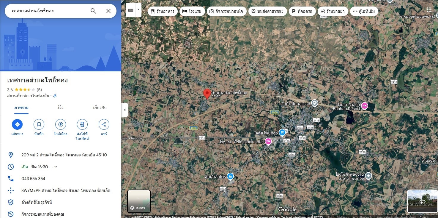 เทศบาลตำบลโพธิ์ทอง เลขที่ 209 หมู่ 2 ตำบลโพธิ์ทอง อำเภอโพนทอง จังหวัดร้อยเอ็ด 45110